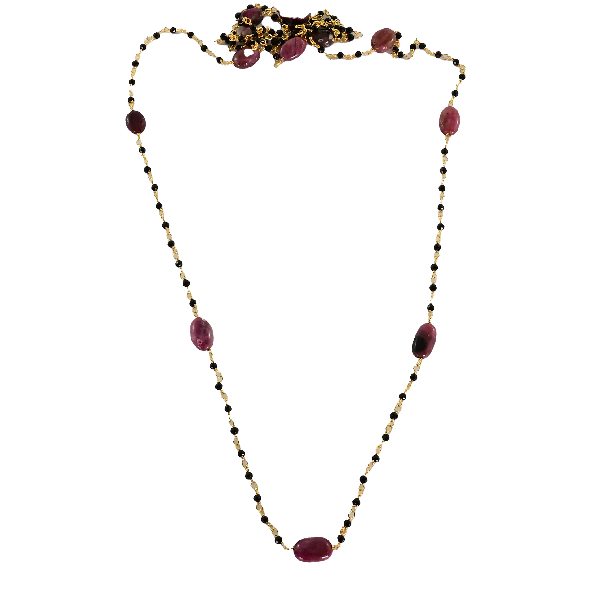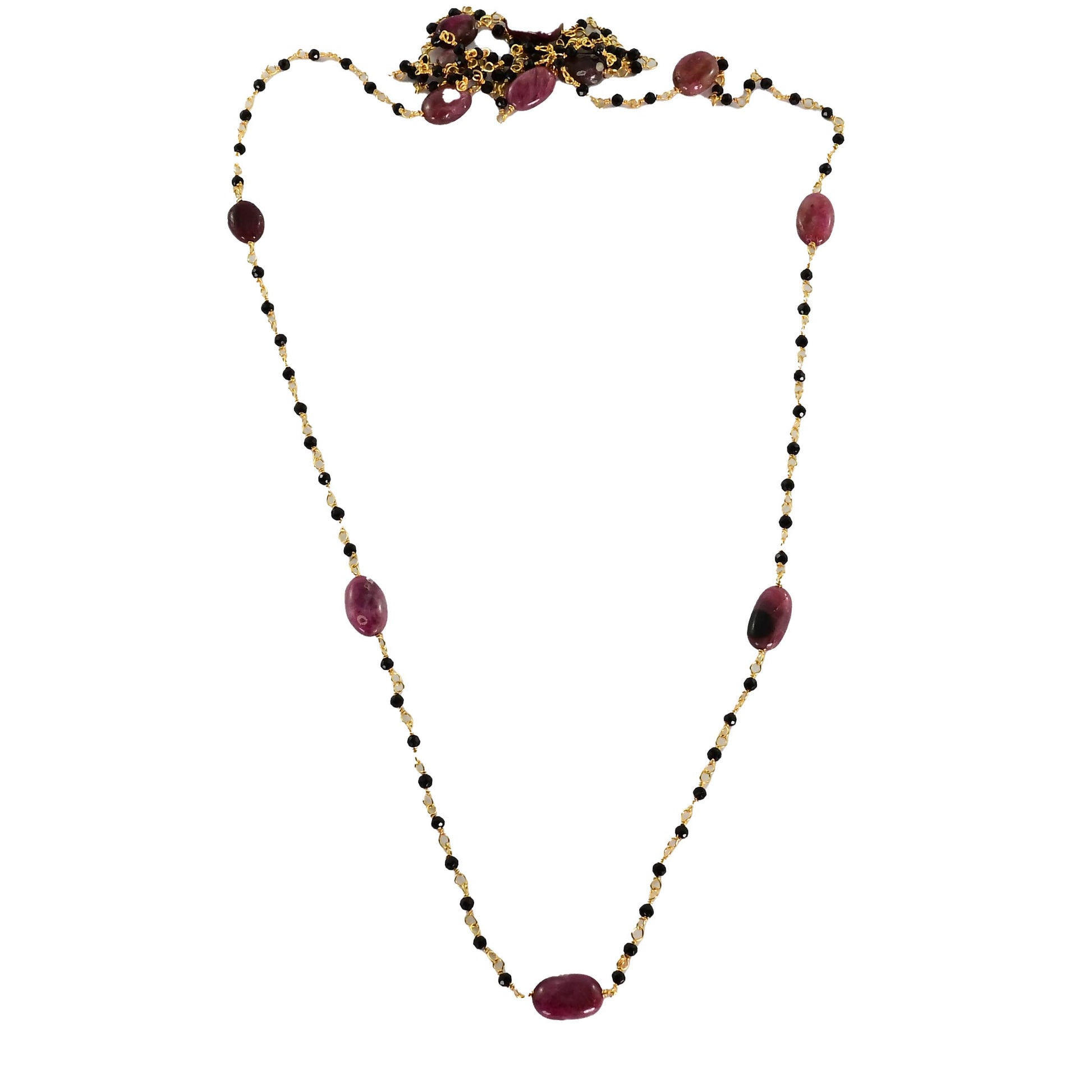 Lovely necklace with tourmalines and spinel knotted on a fine gold chain 80 cm long