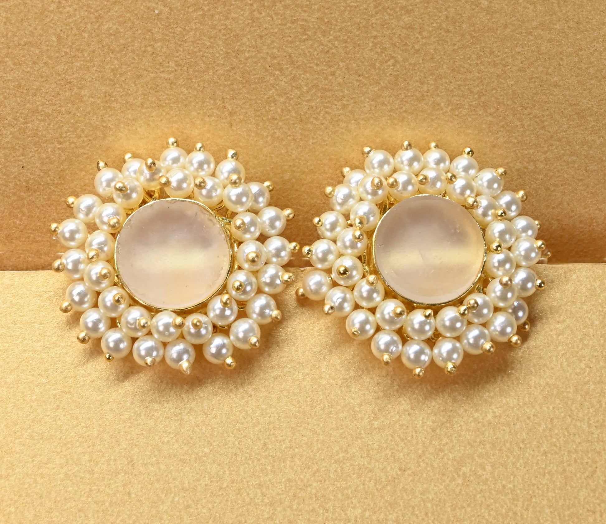 Matte finish earrings with a quartz gem surrounded by a flourish of white freshwater pearls.
