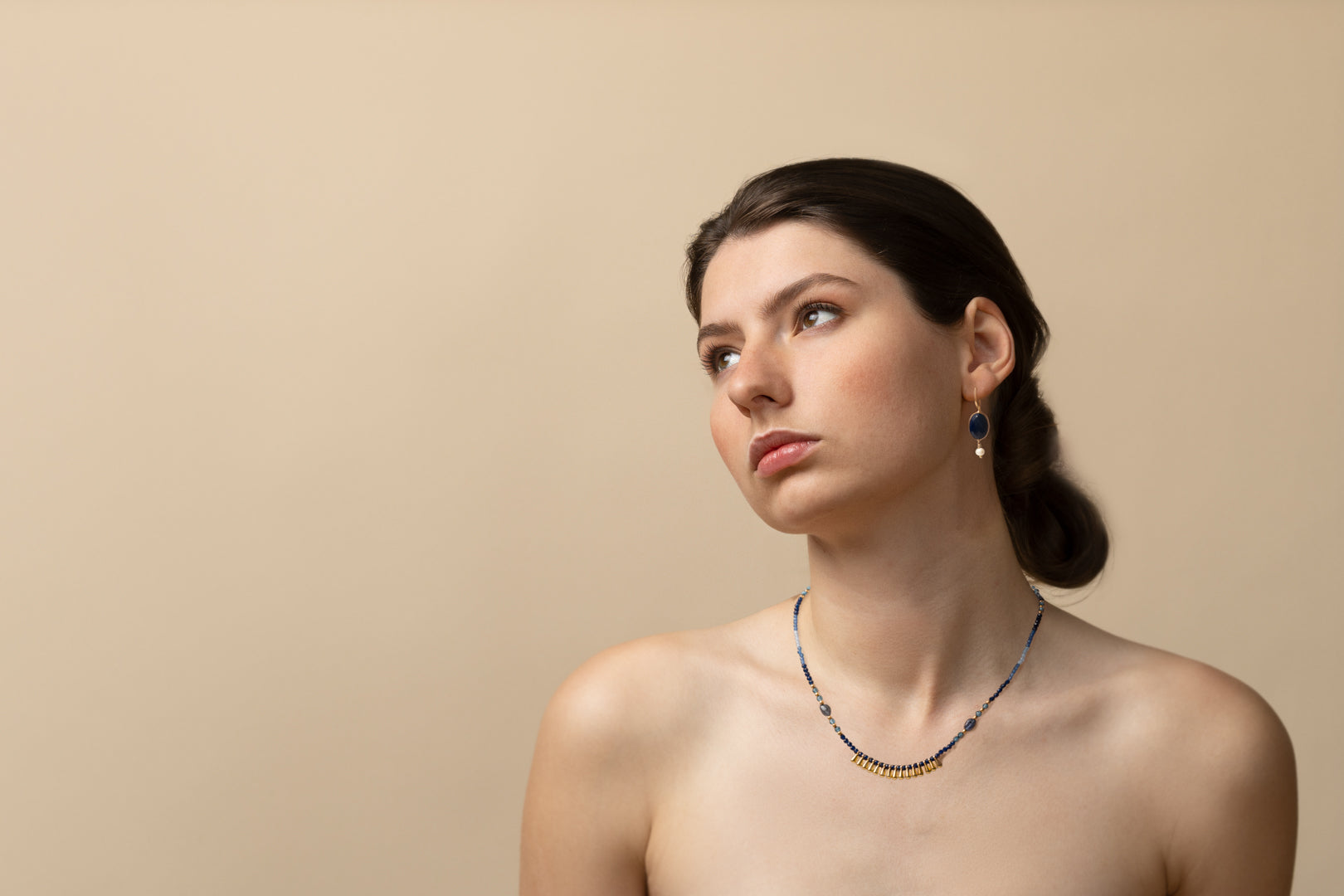This design comes in Lapis with a tiny pearl drop. This piece reminds me of the classic jewellery of ancient greece, Roman cultures and Egyptian antiquity.