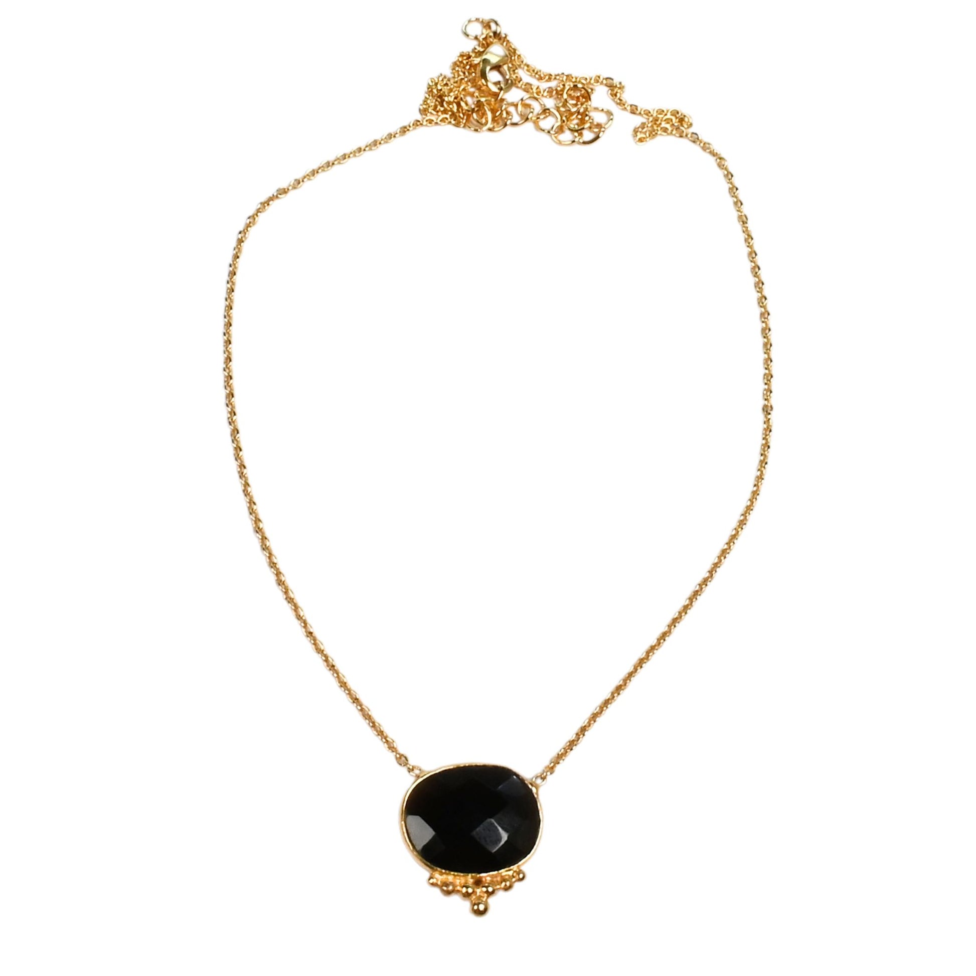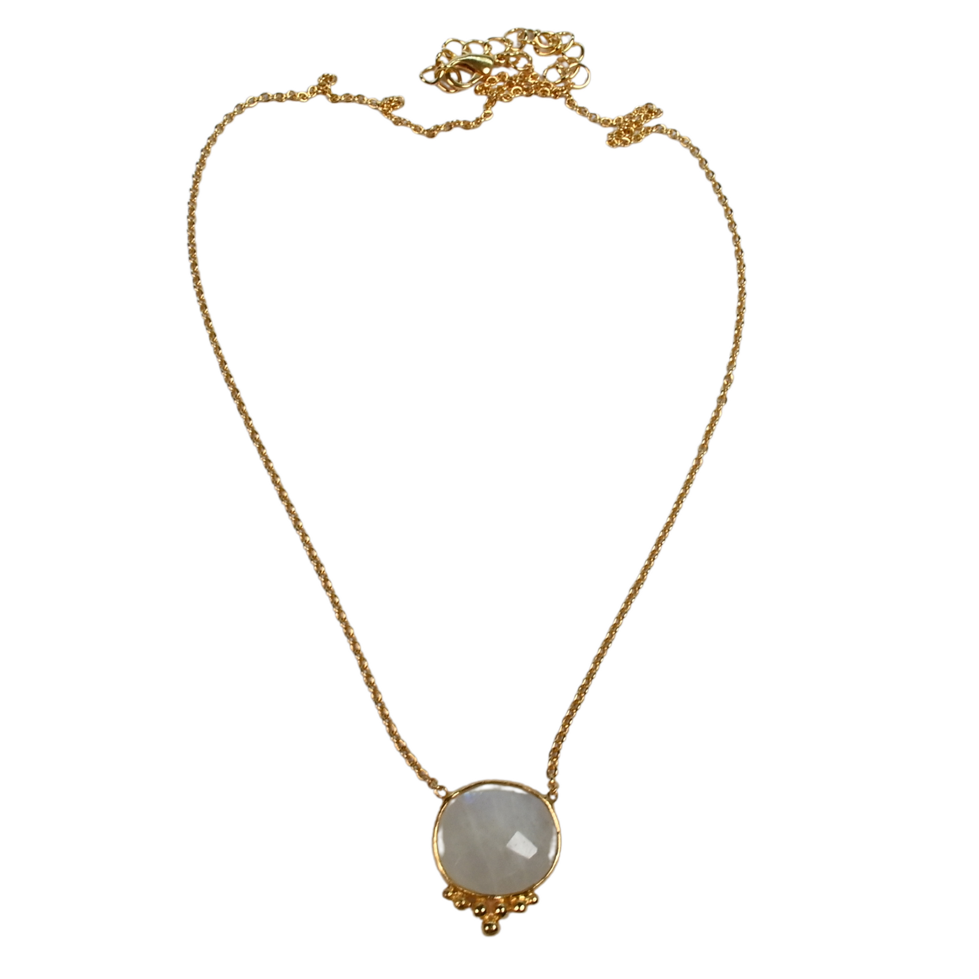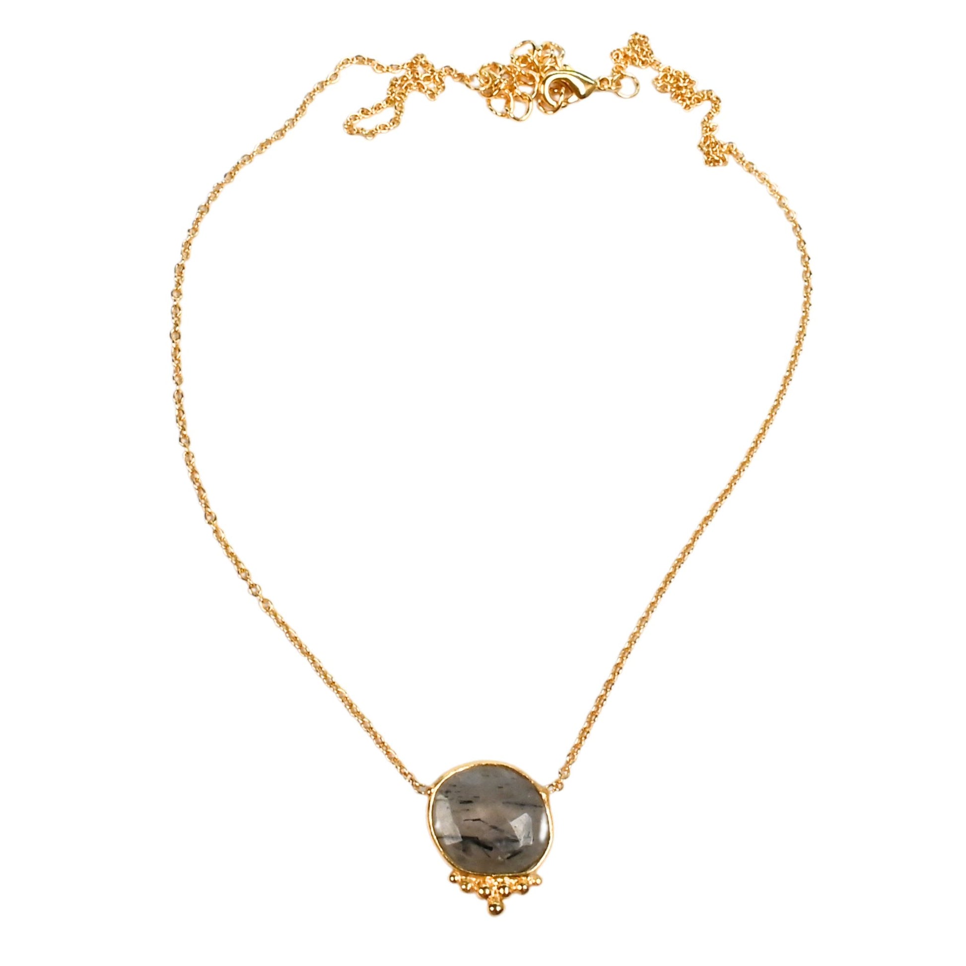 A lovely Gemstone Necklace on a fine loop chain features a flat cut gemstone, each one is a little different, with a super cute little collection of filigree balls at the base.